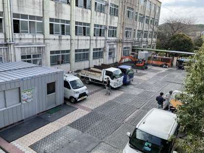 今週から、エレベーターと体育館前のスロープ設置工事が始まりました。中庭では工事が進んでいます。子どもたちもどんな様子か気になっているようです。ガードマンさんが子どもたちの安全を見守ってくれています。