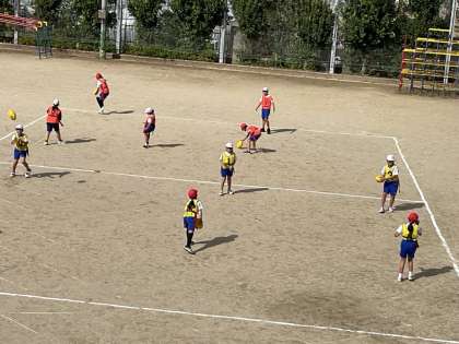 チームの友達とパスの練習をしました。楕円形なので、ボールの扱いが少し難しいようです。コツをつかんだ子が友達に教えてあげていました。