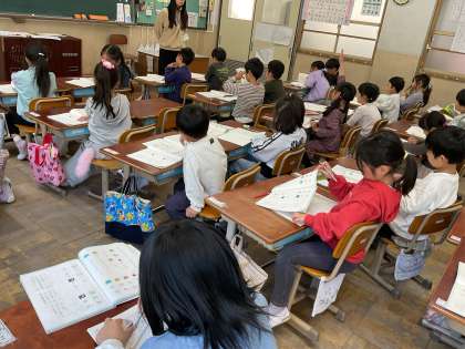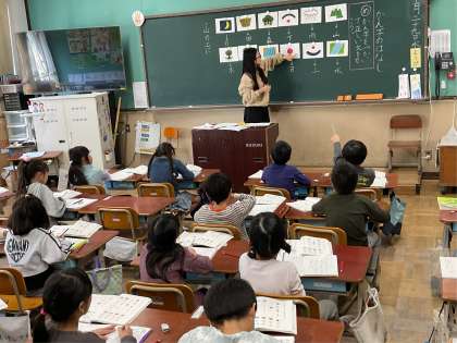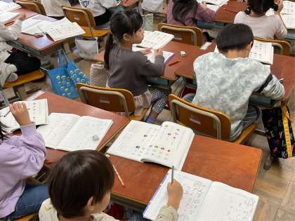絵と漢字を見比べて、絵からできている漢字の意味について学習しました。例文にある絵を漢字に直して読んだり、ノートに書いたりしました。丁寧に字を書いていました。