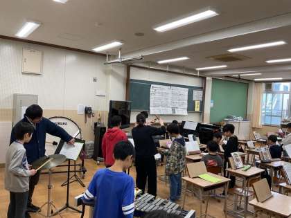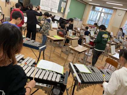 「キリマンジャロ」の合奏練習をしています。低音楽器や打楽器などのパートに分かれて練習した後に、全員で合わせます。打楽器のリズムが少し難しいですが、お互いの音を聞き合って演奏していました。