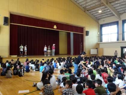 7月10日に児童集会がありました。今回は赤・白・青の色別にならびました。