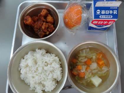今日の献立は「麦ごはん・牛乳・たらのアングレス・春野菜のスープ煮・甘夏みかん」でした。