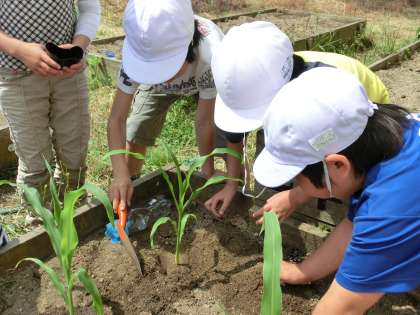 5月20日,学校の花壇に野菜の苗植えをしました。とうもろこし、ピーマン、ししとう、なす、ミニトマト、オクラの苗を植えました。ピーマンやオクラの苗は初めて見た子も多く、それぞれの野菜の葉や茎の様子を観察しました。どんなふうに育つのだろうと、みんな楽しみにしています。