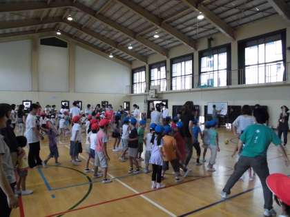 みんなでころがしドッジボールをしましたが,ボールが1コートに3個もあって,大人も子どもも必死でボールに当たらないように逃げていました。