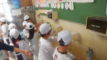 今日で5日目です。子どもたちも新しい学年・学級に慣れてきました。写真は1年生の給食サービスホールでの様子です。
