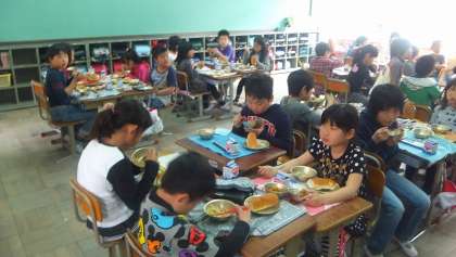 今日の給食献立は,牛乳,たっぷり野菜のビーフン,ぶたにくのケチャップに,あじつけコッペパンでした。写真は3年生の給食の様子です。