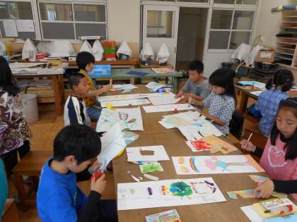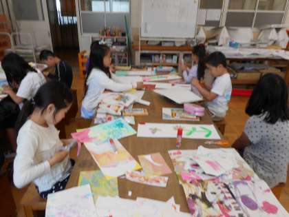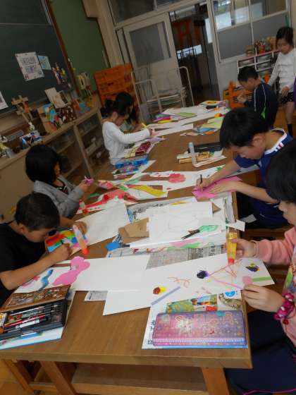 4年生から図工は専科の先生に教えていただいています。前回は,マーブリングや合わせ絵をしたもようの紙を友達と交換しました。今回はその紙を使って,画用紙に春を表現しています。完成が楽しみですね☆