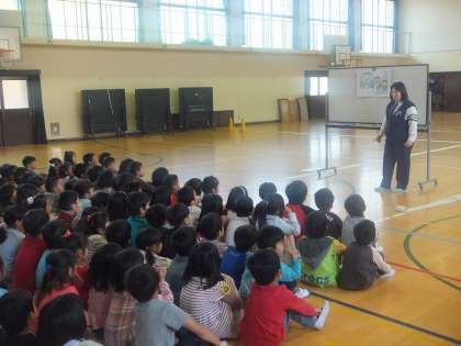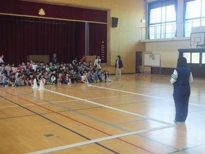7日(水)の2校時に体育館で1年生の交通安全教室を行いました。北警察署の方が来られて,道路歩行について教えていただきました。