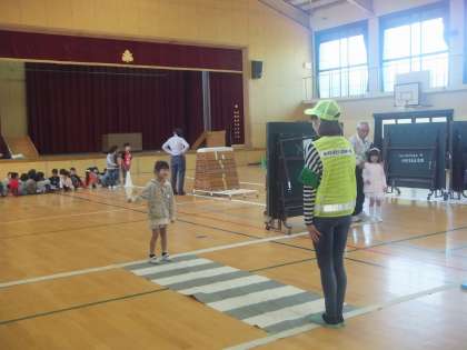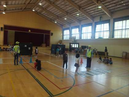体育館に作られた道路で,教えていただいたことをもとに歩きました。学習したことを今後に生かしていってほしいと思います。