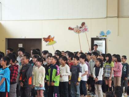 1年生のために,お兄さんお姉さんたちが出し物をしてくれたり,プレゼントを送ってくれたりしました。お礼の意味をこえて1年生が「勇気100パーセント」の歌を歌いました。