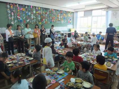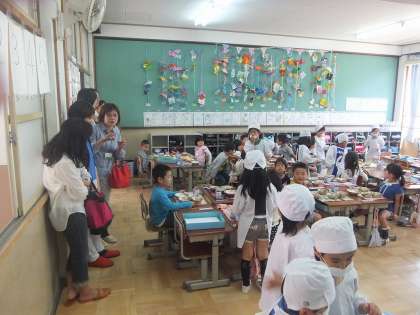 子どもたちが給食を運んだり,配膳したりする様子も見ていただきました。ふだん家庭ではあまり見られない姿に,驚いておられる保護者の方もいらっしゃいました。