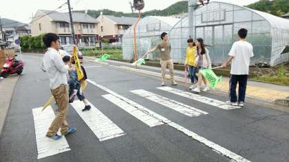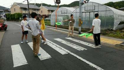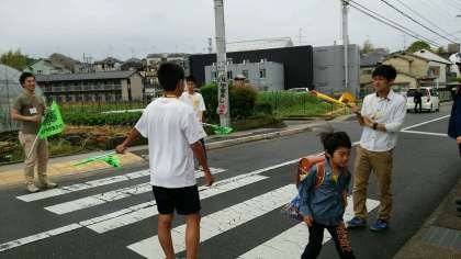 本校へきている教育実習生と西賀茂中学校のチャレンジ学習の生徒が,学校前の信号のところで登校指導を行いました。登校する児童たちも元気に「おはようございます。」と朝のあいさつをしていました。