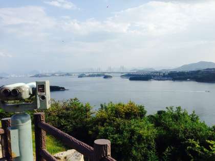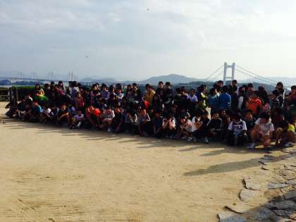 鷲羽山について,素晴らしい景色のなか学年写真です!もうすぐホテルです。