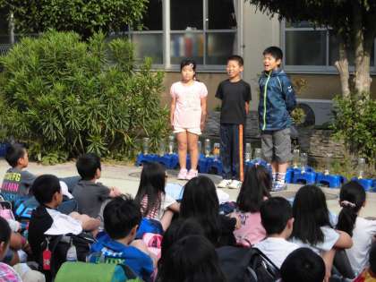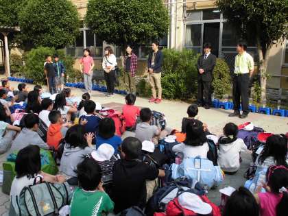 4年生は,今日から2泊3日で三重県の奥志摩みさきの家に行きます。今朝は7時30分に集合し,中庭で出発式を行いました。