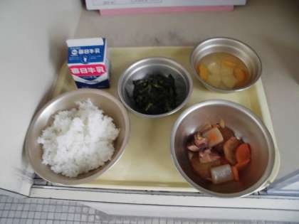 献立は牛乳,ごはん,ひらてんとこんにゃくのにつけ,ほうれんそうのおかかに,フルーツ寒天でした。4時間目に「しっかりとかむ」ことを学習した4年生の子どもたちはしっかりと噛んで食べられたでしょうか。