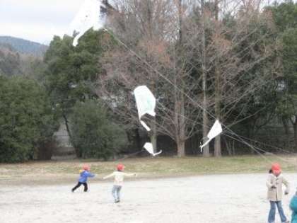 柊野グランドに,たこあげに行きました。風をうまくとらえて,高くあげる子もいて楽しかったです。寒さに負けず,元気いっぱい走り続けていた子もいましたよ。