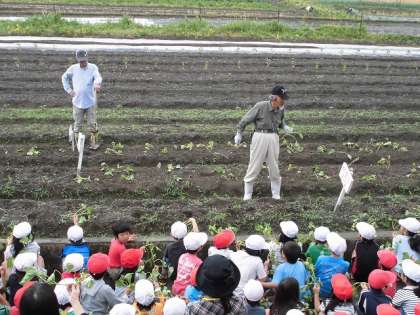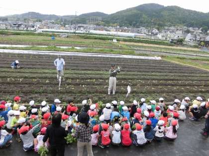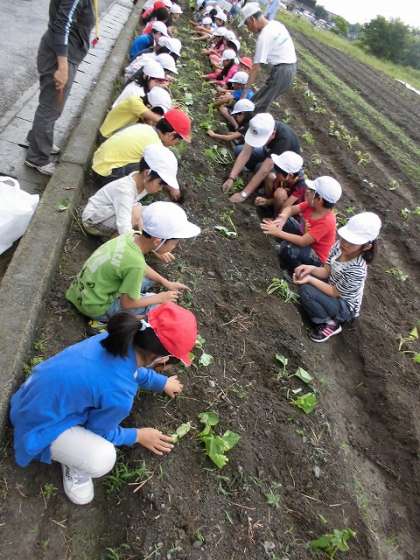今日の午前中に,1,2年生がサツマイモの苗を植えました。地域の方が8人来て下さり,子どもたちに苗の植え方を教えてくださいました。