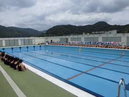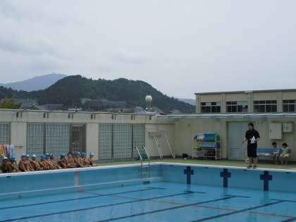 今日からプールでの水遊びがスタートしました。柊野小学校のプールは屋上にあります。屋上からは,上賀茂方面や西賀茂方面の山も望めます。1年生は初めてのプールでの学習をとても楽しみにしていたようです。学習の初めに,先生からプールでの約束ごとを聞きました。