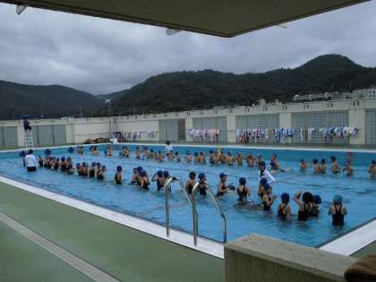 昨日までの低水位での水遊びに続き,今日から水位も上がり水泳学習が始まりました。写真は2年生の水泳学習の様子です。