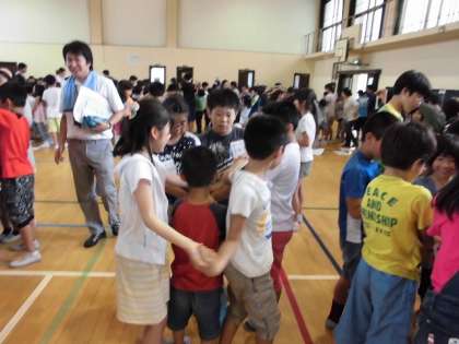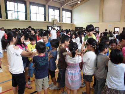 続いて委員会活動からの発表があり,その後たて割りグループごとに人間知恵の輪にチャレンジしました。