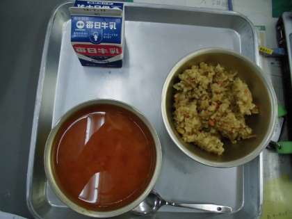 台風が来ることが予想されたので,台風用献立でした。カレーピラフ,トマトスープ,牛乳でした。