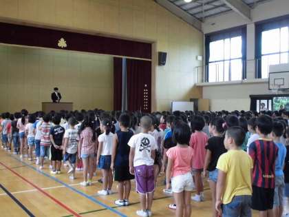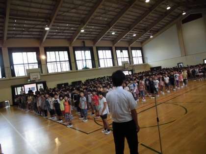 今日26日から夏休み明けの学習がスタートしました。前期後半は,10月24日までです。朝強い雨が降っていて心配しましたが,登校するころには雨もやみ,みんな元気に登校しました。今日は8時35分から体育館で全校朝会があり,校長先生からお話がありました。