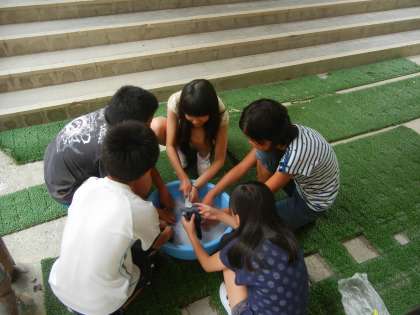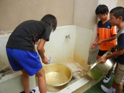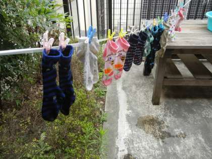 夏休み以降、雨が多いですが27日(水)はみんなで洗濯をしました。天気はあいにくの曇りで「洗濯日和」とはいきませんでしたが、みんなでたらいを囲んで洗濯です。