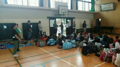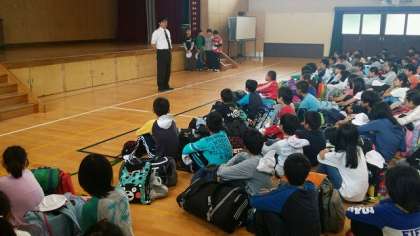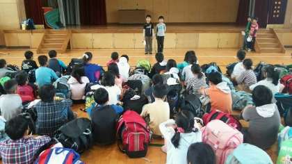 5年生児童は,今日から9月1日(月)までの3泊4日で花背山の家に長期宿泊学習に行きます。午前8時45分から体育館で出発式を行いました。