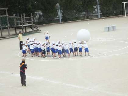 前半はダンスを踊り,後半は小さな紅白青玉を投げて大玉を落とします。いよいよ明日運動会です。
