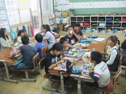 それぞれ決められた教室へ行ってたてわりグループで食べました。初めは少し戸惑っている児童もいましたが,慣れてくると話がはずんでいました。