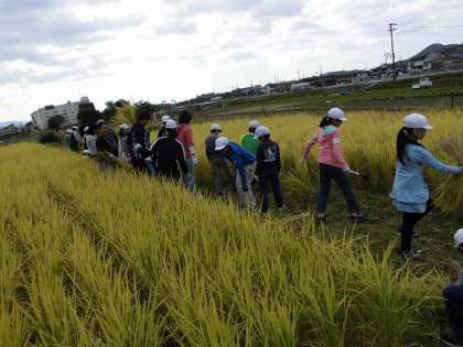 二十四節気の霜降も過ぎ,木枯らし1号も吹きました。朝夕は少し寒いくらいの柊野地域です。今日は朝から5年生の稲刈りがありました。