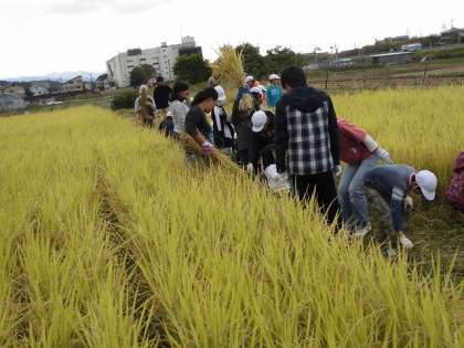 地域の方に教えていただきながら,鎌を使って稲を刈っていきました。