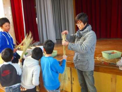 5年生は,10月の稲刈りの際に残ったわらを使って,わら細工をします。今日の1・2校時に地域の方や保護者の方に来ていただき,体育館でわらを60本ずつそろえるところから始めました。