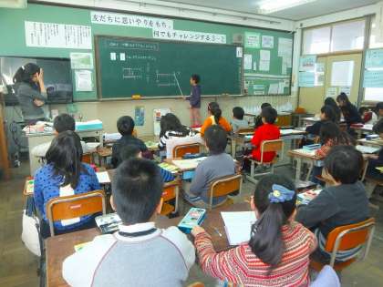 5校時に3年生の算数科研究授業がありました。単元は分数です。子どもたちは,分数の大きさ比べをしました。線分図を使って問題を解き,等号,不等号を使って表しました。