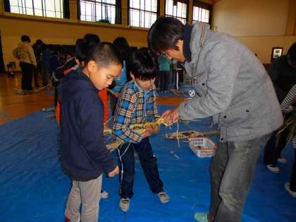 お手本を見せていただき,友だちと3人組でしめ縄づくりに挑戦しました。