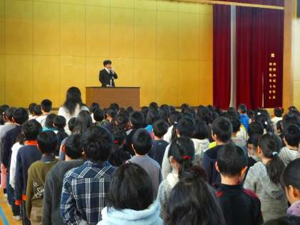 いよいよ明日から子どもたちが楽しみにしている15日間の冬休みでです。新年は1月8日に授業再開します。写真は今日の朝会の様子です。