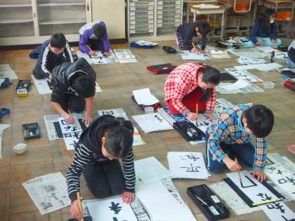 半紙での練習のあと,いよいよ画仙紙に書きました。いつもと違って床に座って書きました。お手本をしっかりと見て,丁寧に一文字一文字書いていきました。