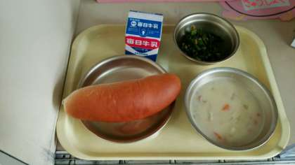 献立は牛乳,ツナとほうれん草のソテー,ミルクコッペパン,とうにゅうのクリームシチューでした。