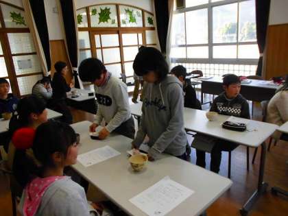お茶の点て方や道具の使い方,お菓子の出し方など女性会の方に教えていただいたことを実践しました。児童からは,「いい体験ができた。」「初めて点てた。楽しかった」などの声が聞かれました。ご指導をいただいた女性会の皆様,ありがとうございました。