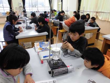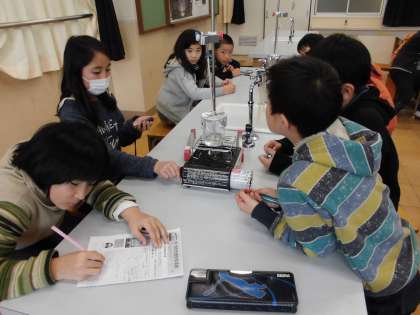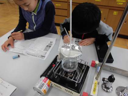 理科では,「すがたをかえる水」という単元を学習しています。今日は,あたためつづけた水はどうなるのか,実験をして調べました。子どもたちからは,「なんでこれ以上温度が上がらないの?」「なんで水がへっていくの?」などたくさんの疑問がわき,もっと知りたいとの意欲が高まっていました。