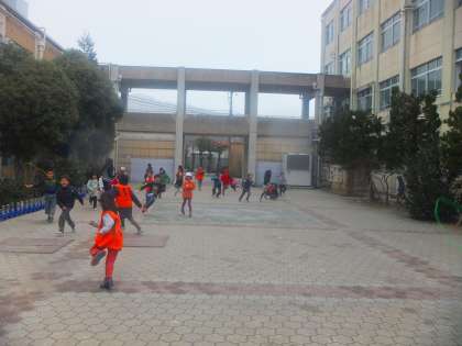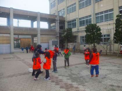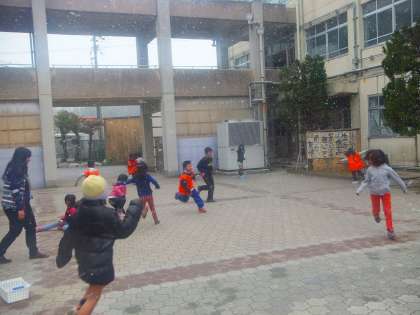 今日の昼休み,2年生が中庭で鬼ごっこをしていました。雪が降りしきる中でしたが,元気に走り回っていました。