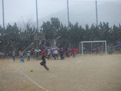 運動場でも雪が降る中で,子どもたちが元気に遊んでいました。