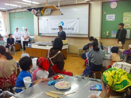 2月23日(土)におやじの会主催の和菓子づくりがありました。はじめに学校歯科医の先生に歯の健康についてお話いただきました。