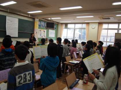 今年度,音楽は専科の先生に指導していただきます。うたを歌うときの姿勢や,気を付けるポイントを教えていただきました。