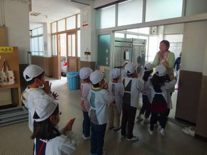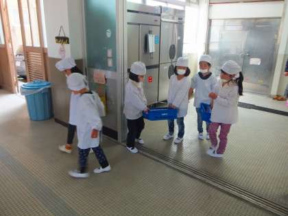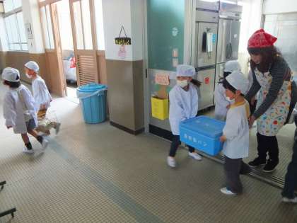 給食が始まって4日目,1年生も給食当番の仕事に慣れてきました。