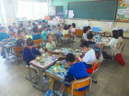 2年生の給食の様子です。2年生になって,教室も本館から南館に変わりました。