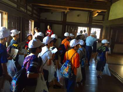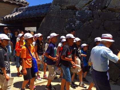 姫路城内を見学しました。青空に白漆喰の姫路城が映え、とても美しいです。ガイドさんのお話に、子どもたちは興味津々です。