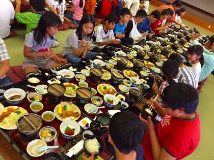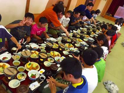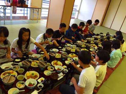 夕食の様子です。瀬戸大橋の見える部屋で、みんなで楽しく食べました。