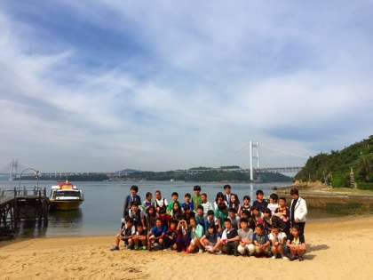 退館式を行いました。砂浜で集合写真を撮り、これから瀬戸大橋を渡って香川県へ向かいます。