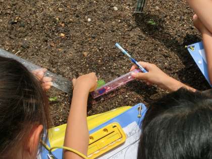 ヒマワリとホウセンカの子葉が出ました。「ヒマワリは子葉が丸いな。」「オクラの葉より,ホウセンカの葉のほうが明るいみどり色だな。」などいろいろな発見をしていました。